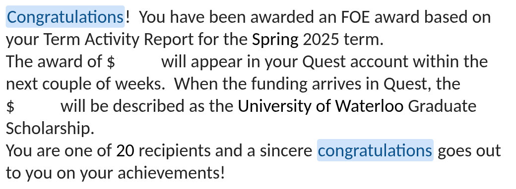 Iām thrilled to announce that I have been awarded an FOE award by the University of Waterloo for the Spring 2025 term. The award will be recognized as the Engineering Graduate Scholarship. This honor places me among 20 distinguished recipients, and I am deeply grateful for this recognition!